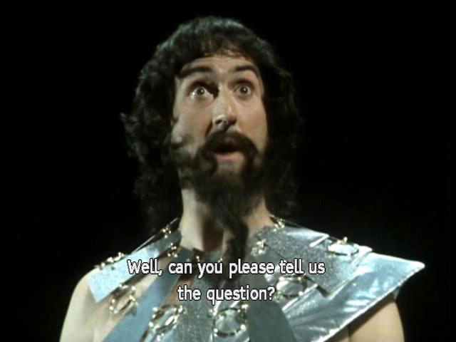 [Priest 1] Well, can you please tell us the question? [Deep Thought] The Ultimate Question? [Priest 2] Yes! [Deep Thought] Of Life, the Universe and Everything? [Priest 1] Yes! [Deep Thought] Tricky. [Priest 2] But can you do it? [Deep Thought] No. _______________ Librarian's Comment: "To be, or not to be: that is the question." -- William Shakespeare |