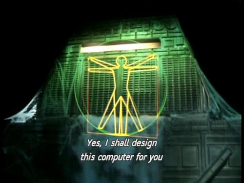 [Deep Thought] You yourselves shall take on new forms and go down into the computer [Deep Thought] to navigate its 10-million-year program! [Deep Thought] Yes, I shall design this computer for you [Deep Thought] and I shall name it also unto you |