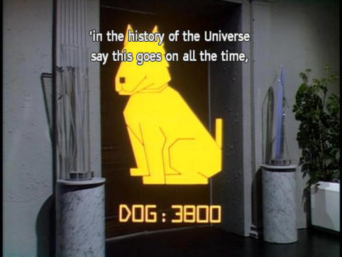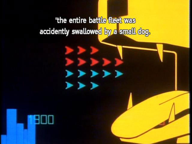 'where, due to a terrible miscalculation of scale, 'the entire battle fleet was accidentally swallowed by a small dog. 'Those who study the interplay of cause and effect 'in the history of the Universe say this goes on all the time, 'but that they are powerless to prevent it. |