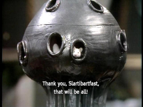 [Slartibartfast] I've got a thousand glaciers poised and ready to roll over Africa! [Frankie] Thank you, Slartibartfast, that will be all! [Slartibartfast] Yes, sir. Thank you very much. [Slartibartfast] Well ... [Slartibartfast] ... goodbye, Earthman. [Slartibartfast] Sorry about your planet. Hope the lifestyle comes together! |
