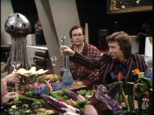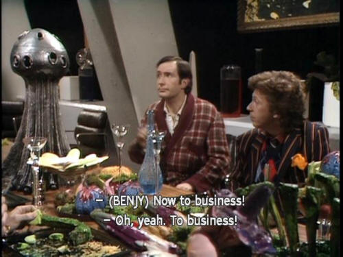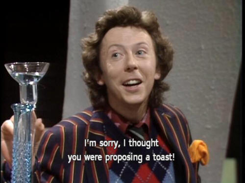 [Benjy] Now to business! [Ford] Oh, yeah. To business! [All] To business! [Benjy] I beg your pardon?! [Ford] I'm sorry, I thought you were proposing a toast! |