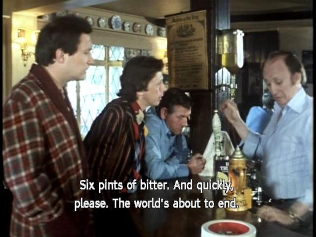 [Ford] Six pints of bitter. And quickly, please. The world's about to end.