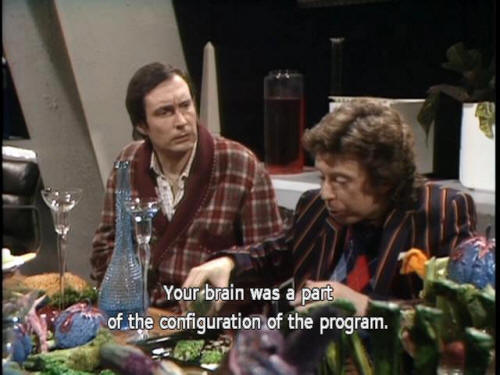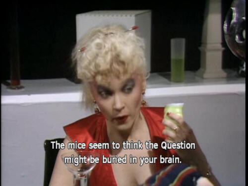 [Ford] Your brain was a part of the configuration of the program. [Arthur] Of the whatty? [Ford] Drink? [Arthur] I will. [Trillian] The mice seem to think the Question might be buried in your brain. [Ford] Is that what they think? [Trillian] Yes. They wanna buy it. |