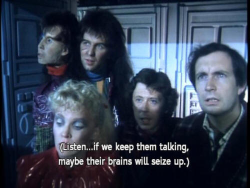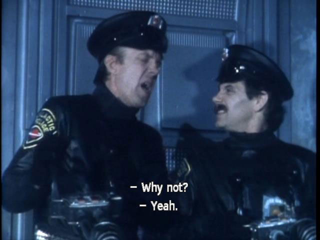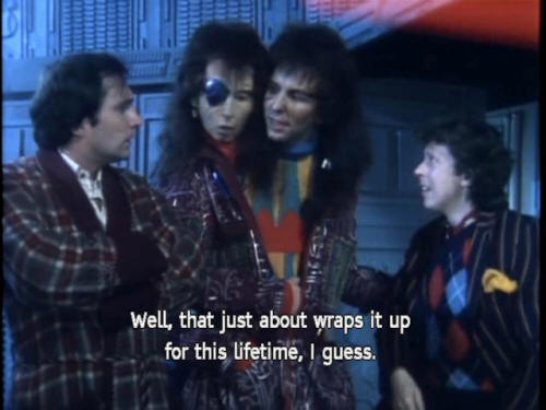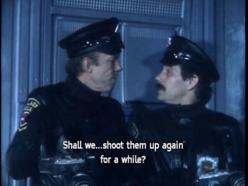 [Ford] Listen ... if we keep them talking, maybe their brains will seize up. [Cop 1] Shall we ... shoot them up again for a while? [Cop 2] Why not? [Cop 1] Yeah. [Ford] Wait ... [Zaphod] Well, that just about wraps it up for this lifetime, I guess. |