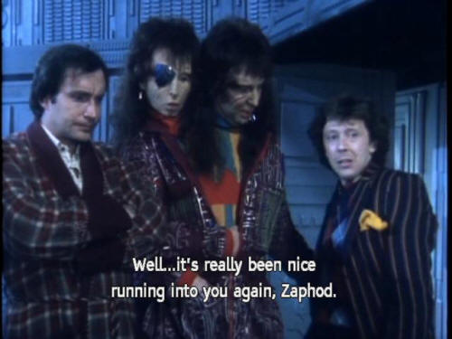 [Ford] Well ... it's really been nice running into you again, Zaphod. [BOTH SING LOUDLY] Zaglabor astragard [Both] Hootrimansion Bambriar ... [Arthur] What the hell are you doing?! [Ford] A Betelgeuse death anthem. [Ford] It means, "After this, things can only get better." [Both] Zaglabor astragard! |