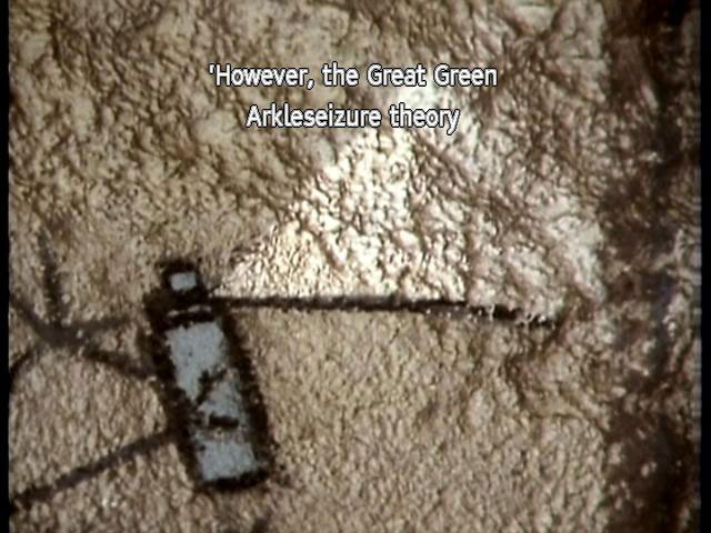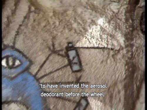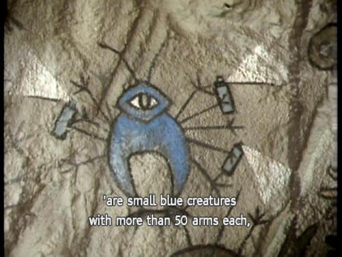 'of the time they call The Coming of the Great White Handkerchief, 'are small blue creatures with more than 50 arms each, 'who are therefore unique in being the only race in history 'to have invented the aerosol deodorant before the wheel. 'However, the Great Green Arkleseizure theory 'was not widely accepted outside Viltvodle VI, DRAWINGS FOUND IN ATOMIC FALL OUT SHELTER ON JIKTHROOM BETA |