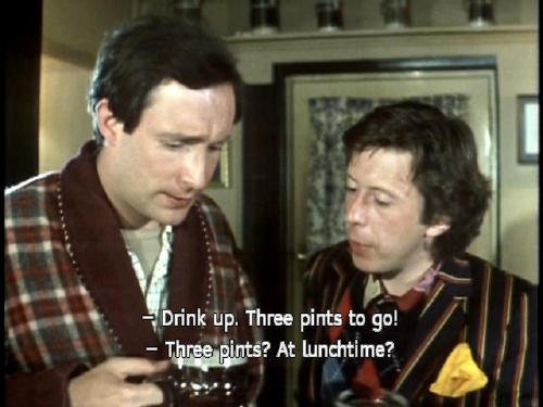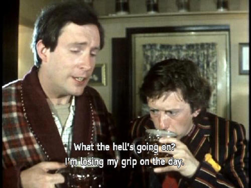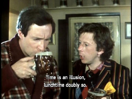 [Arthur] What the hell's going on? I'm losing my grip on the day. [Ford] Drink up. Three pints to go! [Arthur] Three pints? At lunchtime? [Ford] Time is an illusion, lunchtime doubly so. [Arthur] Send that in to the Reader's Digest. There's a page for people like you! |