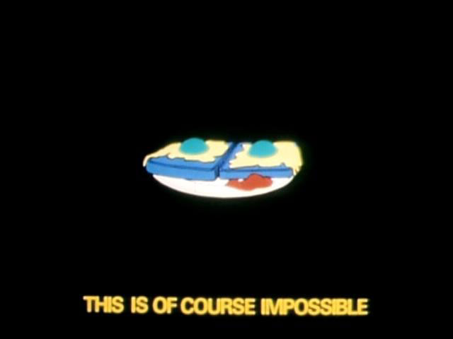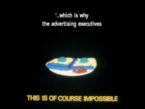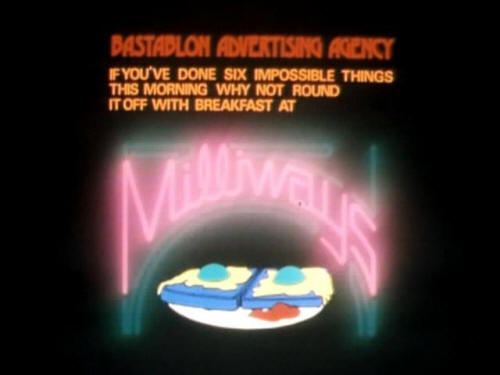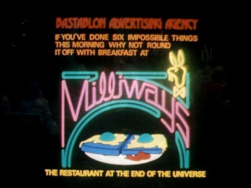 THIS IS OF COURSE IMPOSSIBLE '... which is why the advertising executives 'of the star system of Bastablon came up with this slogan: BASTABLON ADVERTISING AGENCY IF YOU'VE DONE SIX IMPOSSIBLE THINGS THIS MORNING WHY NOT ROUND IT OFF WITH BREAKFAST AT MILLIWAYS, THE RESTAURANT AT THE END OF THE UNIVERSE |