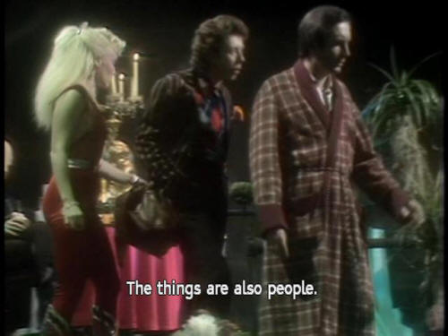 [Waiter] This way, please. [Zaphod] Wowee! Zappo! [Arthur] Incredible! The people, the things! [Ford] The things are also people. [Arthur] The people? The also people? [Trillian] The lights! |