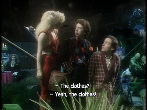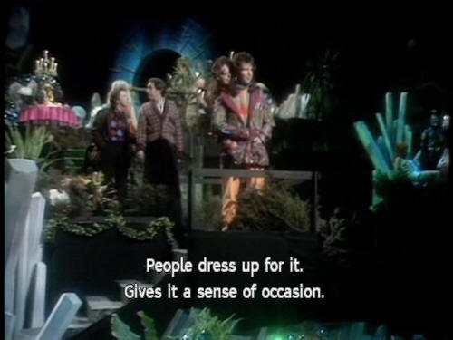 [Arthur] The food! [Trillian] The clothes! [Trillian] The clothes?! [Ford] Yeah, the clothes! [Ford] The End of the Universe is very popular. [Ford] People dress up for it. Gives it a sense of occasion. |