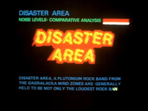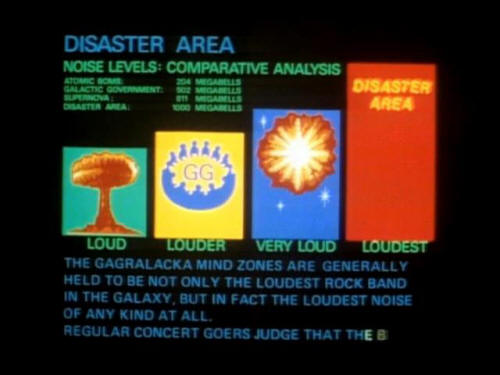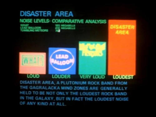 [Ford] Oh, why? What's the matter with him? 'The Hitchhiker's Guide To The Galaxy notes that: DISASTER AREA NOISE LEVELS: COMPARATIVE ANALYSIS. DISASTER AREA, A PLUTONIUM ROCK BAND FROM THE GAGRALACKA MIND ZONES ARE GENERALLY HELD TO BE NOT ONLY THE LOUDEST ROCK BAND IN THE GALAXY, BUT IN FACT THE LOUDEST NOISE OF ANY KIND AT ALL. |