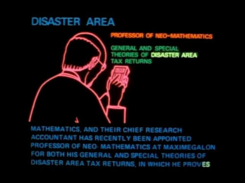AND THEIR CHIEF RESEARCH ACCOUNTANT HAS RECENTLY BEEN APPOINTED PROFESSOR OF NEO MATHEMATICS AT MAXIMEGALON FOR BOTH HIS GENERAL AND SPECIAL THEORIES OF DISASTER AREA TAX RETURNS, IN WHICH HE PROVES |