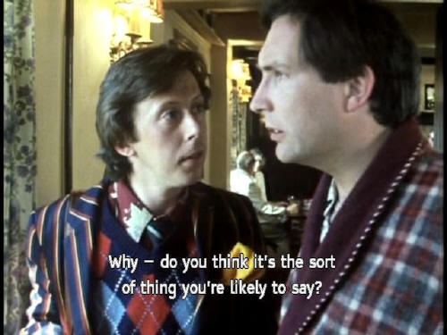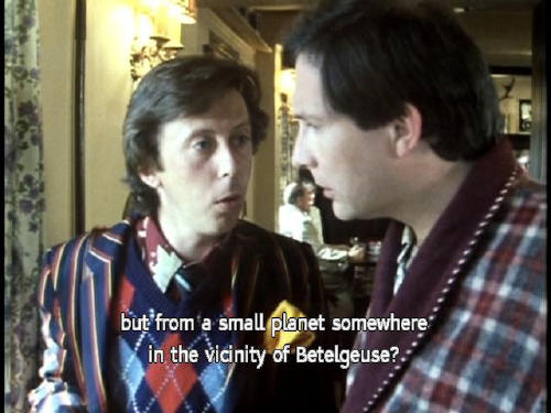 [Ford] How would you react if I told you I'm not from Guildford after all, [Ford] but from a small planet somewhere in the vicinity of Betelgeuse? [Arthur] Why -- do you think it's the sort of thing you're likely to say? [Ford] Drink up. The world is about to end. |