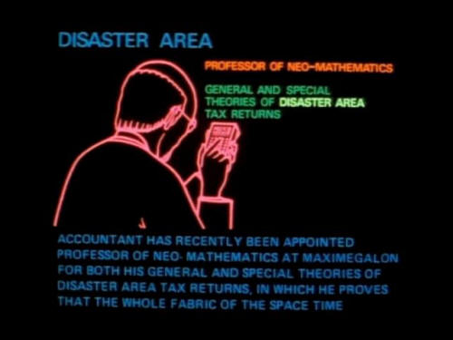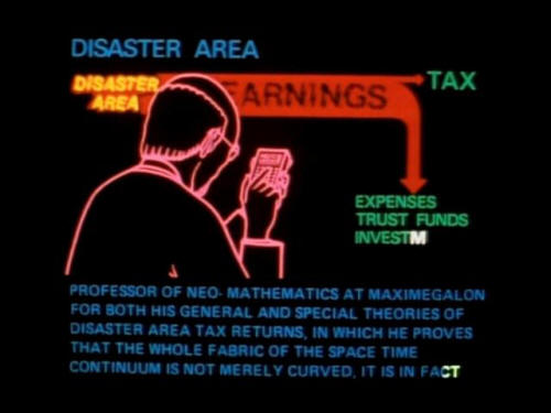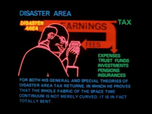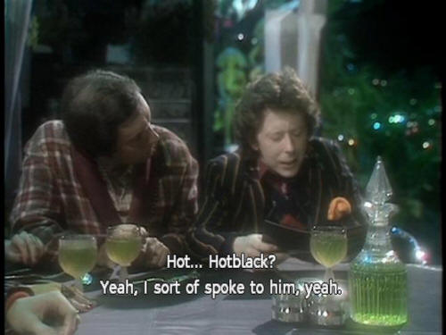 THAT THE WHOLE FABRIC OF THE SPACE TIME CONTINUUM IS NOT MERELY CURVED, IT IS IN FACT TOTALLY BENT. [Zaphod] Oh, hi, there, Ford. Did you talk to your big-noise friend? [Ford] Hot ... Hotblack? Yeah, I sort of spoke to him, yeah. |