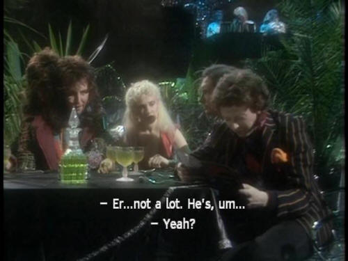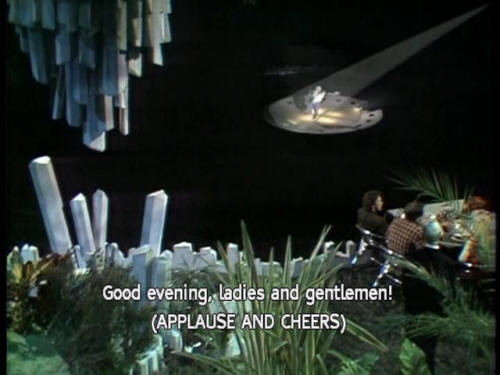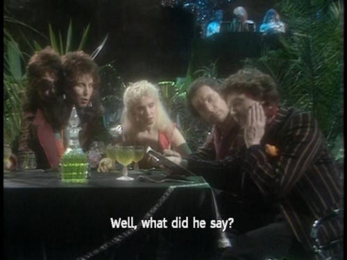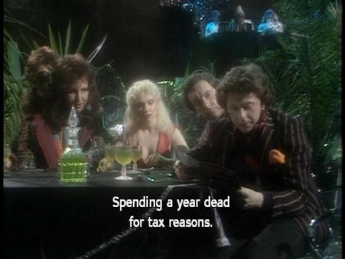 [Zaphod] Well, what did he say? [Ford] Er ... not a lot. He's, um ... [Zaphod] Yeah? [Ford] Spending a year dead for tax reasons. [Zaphod] Oh, yeah? Neat! [Host] Good evening, ladies and gentlemen! (APPLAUSE AND CHEERS) |