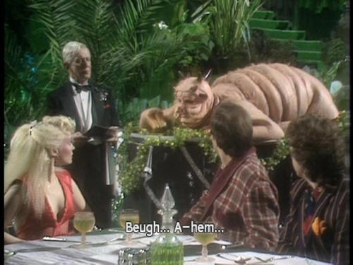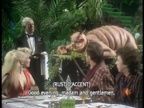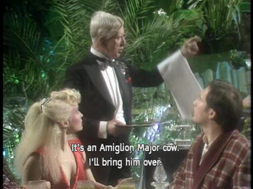 [Arthur] Meet? [Trillian] What is it? [Waiter] It's an Amiglion Major cow. I'll bring him over. [Zaphod] OK, we'll meet the meat. That's cool! [Dish of the Day] Beugh ... A-hem ... [Dish of the Day] (RUSTIC ACCENT) Good evening, madam and gentlemen, |