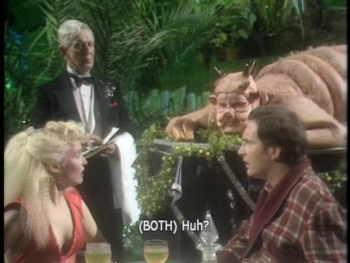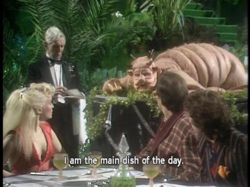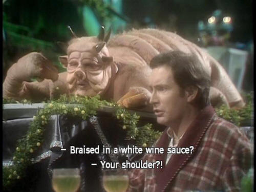 [Dish of the Day] I am the main dish of the day. [Dish of the Day] May I interest you in parts of my body? [Both] Huh? [Ford] Oh, well. [Dish of the Day] Something off my shoulder, perhaps? [Dish of the Day] Braised in a white wine sauce? [Arthur] Your shoulder?! |