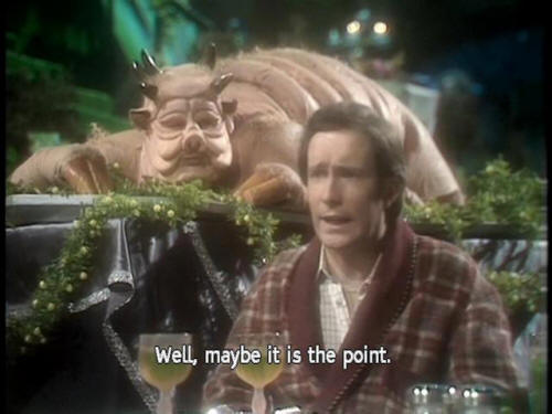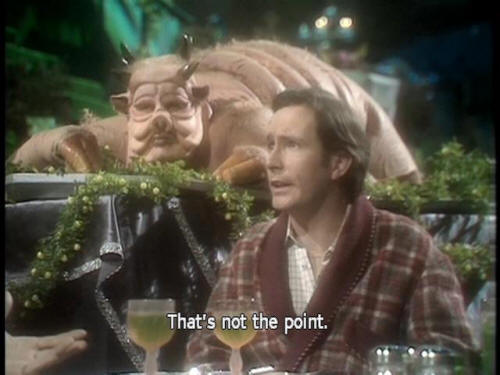 [Arthur] I don't want to eat an animal that's inviting me to! [Zaphod] It's better than eating an animal that doesn't want to be eaten. [Arthur] That's not the point. [Arthur] Well, maybe it is the point. [Arthur] I don't want to talk about it. I'll have a green salad. |