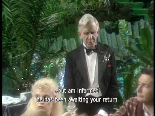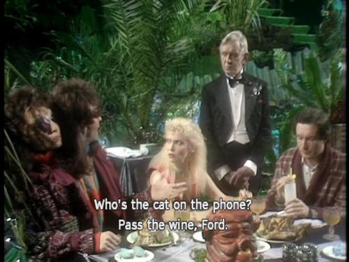 [Zaphod] Who's the cat on the phone? Pass the wine, Ford. [Waiter] I am not personally acquainted with the metal gentleman, sir ... [Trillian] Metal? [Waiter] ... but am informed he has been awaiting your return [Waiter] for a considerable number of millennia. |