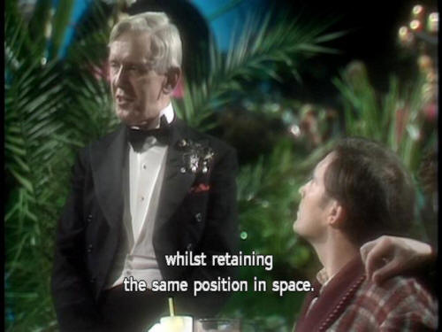 [Arthur] Go bang your heads together, four eyes! [Waiter] No, no. Your monkey has got it right. [Waiter] You jumped forward many millions of years in time [Waiter] whilst retaining the same position in space. |