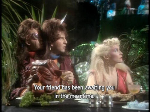 [Waiter] Your friend has been awaiting you in the meantime. [Trillian] Marvin! It must be Marvin! [Ford] The paranoid android! [Zaphod] Space cookies! Hand me the rap rod plate, captain! [Waiter] I beg your pardon, sir? |