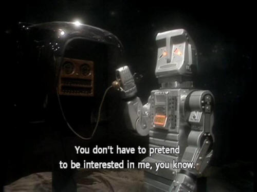 [Marvin] I'm feeling very depressed. [Marvin] Yeah? We're having a great time -- wine, food, [Zaphod] and the Universe going foom! Where are you, Marvin? [Marvin] You don't have to pretend to be interested in me, you know. [Marvin] I know perfectly well I'm only a menial robot. |