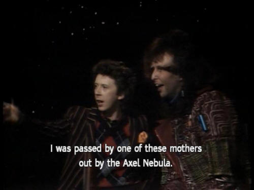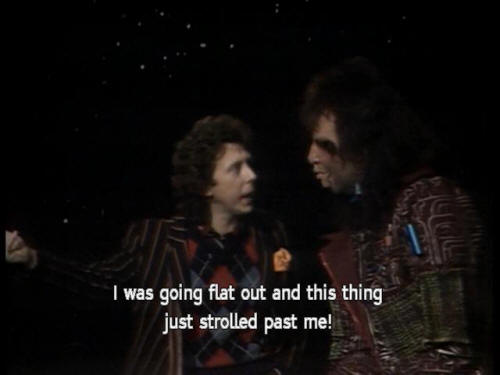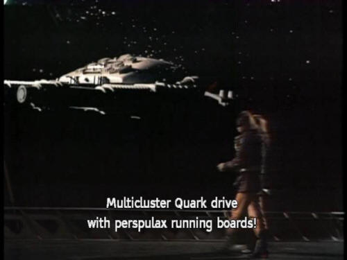 [Zaphod] Hey, get this number. [Zaphod] Multicluster Quark drive with perspulax running boards! [Zaphod] This has got to be a Lazlar Lyricon custom job. [Ford] I was passed by one of these mothers out by the Axel Nebula. [Ford] I was going flat out and this thing just strolled past me! |