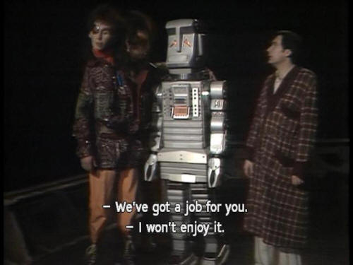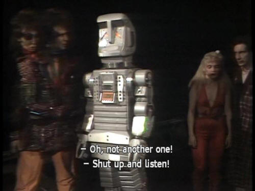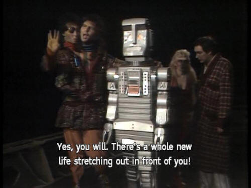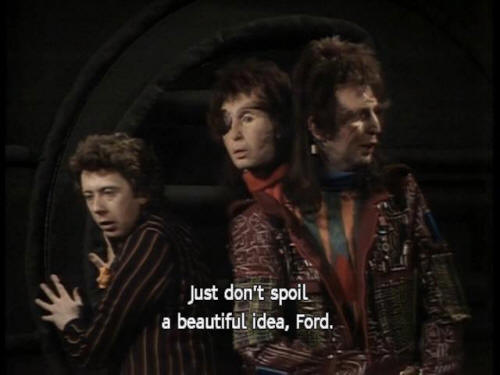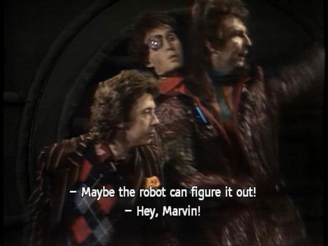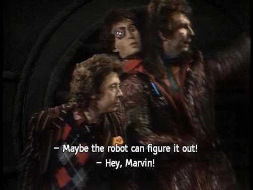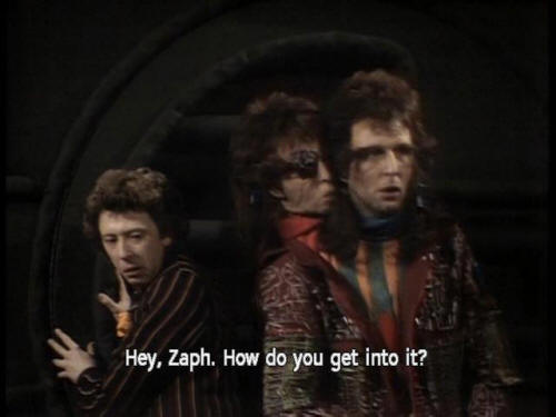 [Ford] Hey, Zaph. How do you get into it? [Zaphod] Just don't spoil a beautiful idea, Ford. [Ford] Maybe the robot can figure it out! [Zaphod] Hey, Marvin! [Zaphod] We've got a job for you. [Marvin] I won't enjoy it. [Zaphod] Yes, you will. There's a whole new life stretching out in front of you! [Marvin] Oh, not another one! [Zaphod] Shut up and listen! |