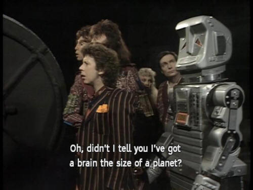 [Ford] How did you do that, Marvin? [Marvin] Oh, didn't I tell you I've got a brain the size of a planet? [Zaphod] Oh, yeah. [Ford] Hey, Zaph, come and have a look at this. |