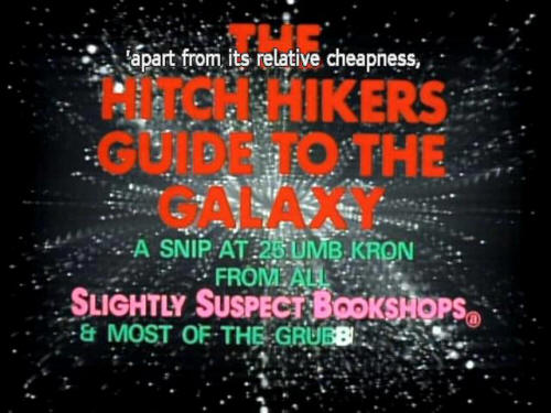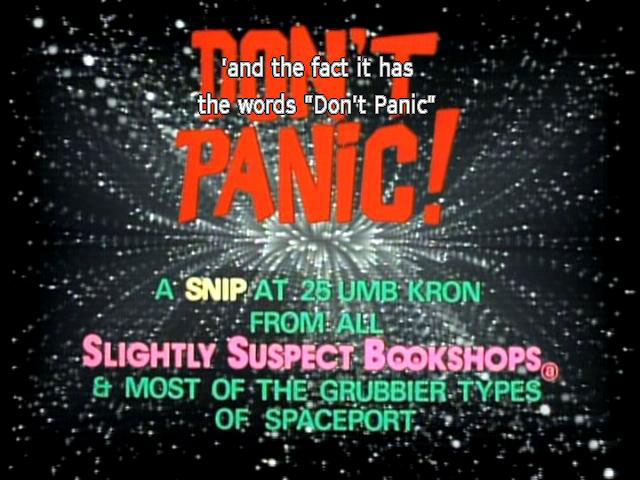 'One of the major selling points 'of that whollly remarkable book THE HITCHHIKERS GUIDE TO THE GALAXY 'apart from its relative cheapness, 'and the fact it has the words "Don't Panic" A SNIP AT 26 UMB KRON FROM ALL SLIGHTLY SUSPECT BOOKSHOPS & MOST OF THE GRUBBIER TYPES OF SPACEPORT |