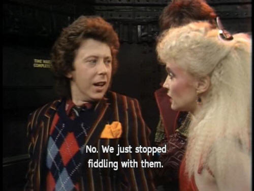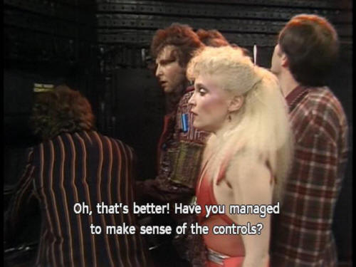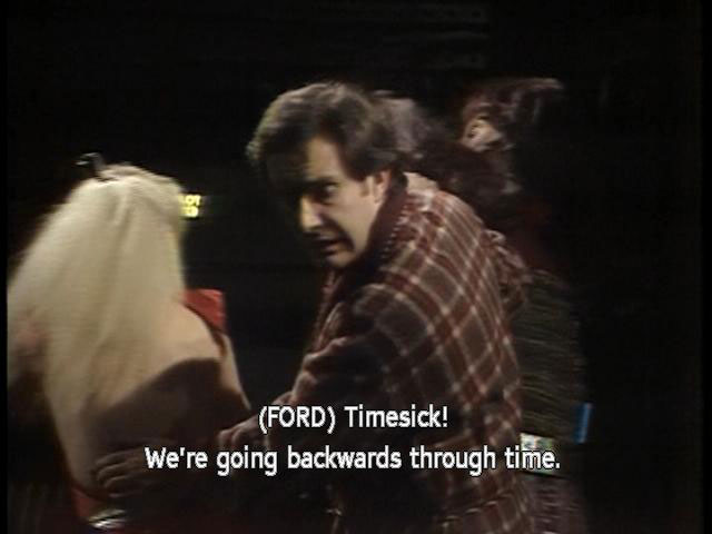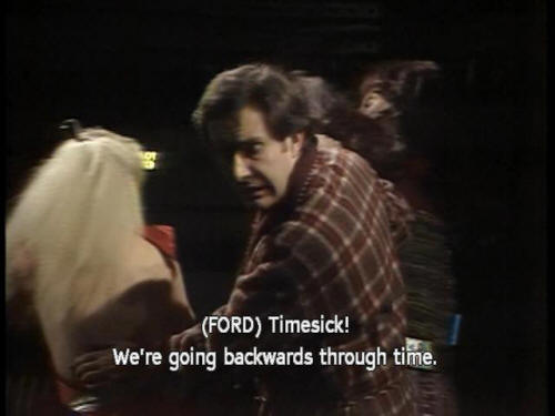 [Ford] Timesick! We're going backwards through time. [Arthur] Now I AM going to be ill! [Zaphod] We could do with some colour here. [Trillian] Oh, that's better! Have you managed to make sense of the controls? [Ford] No. We just stopped fiddling with them. |