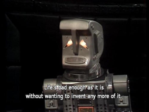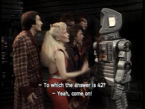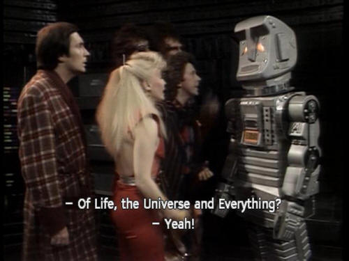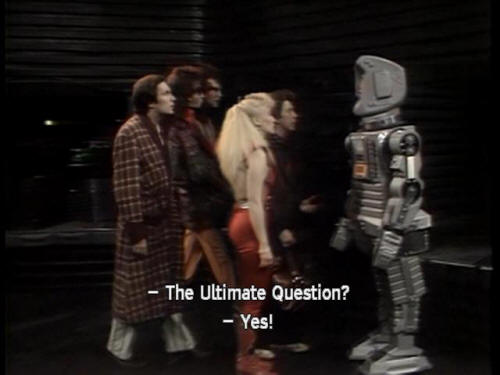 [Marvin] Life's bad enough as it is without wanting to invent any more of it. [Trillian] Marvin, if you knew all along, why didn't you tell us? [Marvin] You didn't ask. [Ford] We're asking now. What's the question? [Marvin] The Ultimate Question? [Ford] Yes! [Marvin] Of Life, the Universe and Everything? [All] Yeah! [Marvin] To which the answer is 42? [All] Yeah, come on! |