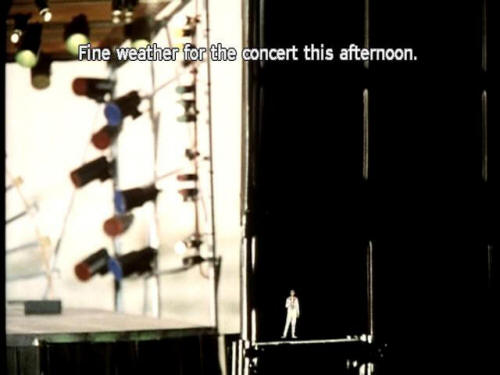 [MC] Fine weather for the concert this afternoon. [MC} I'm standing here on stage in the desert, [MC} and with my hyper-binoctic glasses [MC] I can just make out the huge audience on the horizon all around. [MC] Behind me, huge speaker stacks rise like a cliff face, [MC] high above the sun is shining and doesn't know what's going to hit it. |
