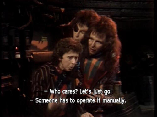 [Zaphod] Who cares? Let's just go! [Ford] Someone has to operate it manually. [Ford] Whoever it was would ... would ... [Trillian] Wouldn't ... [Ford] ... Escape. [Zaphod] Hey, Marvin, kid! |