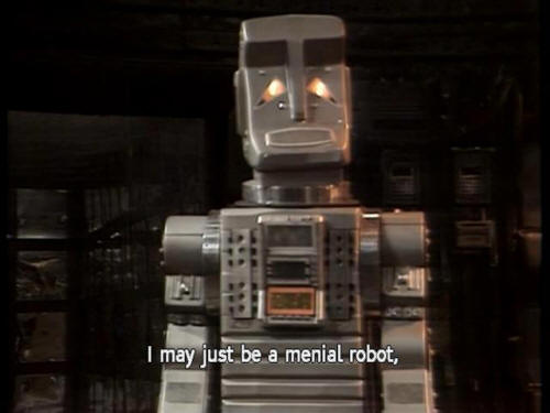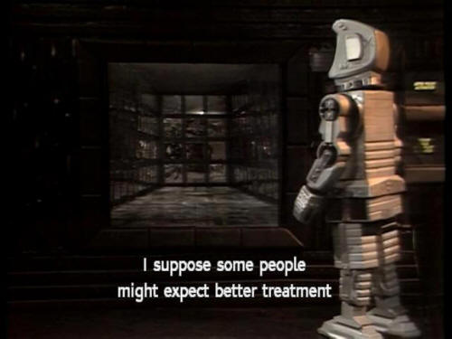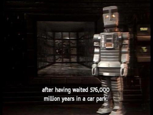 [Marvin] I suppose some people might expect better treatment [Marvin] after having waited 576,000 million years in a car park. [Marvin] But not me. [Marvin] I may just be a menial robot, |