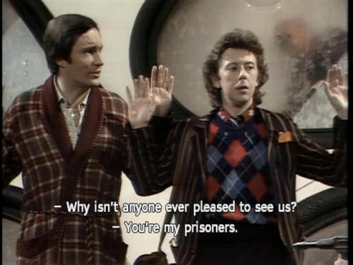 [Arthur] Are you sure these are coffins? They're terribly cold. [Guard] All right! Put your hands up and turn around slowly. [Arthur] Why isn't anyone ever pleased to see us? [Guard] You're my prisoners. [Ford] All right. [Guard] Move! Move! [Ford] Move? [Guard] Move! |