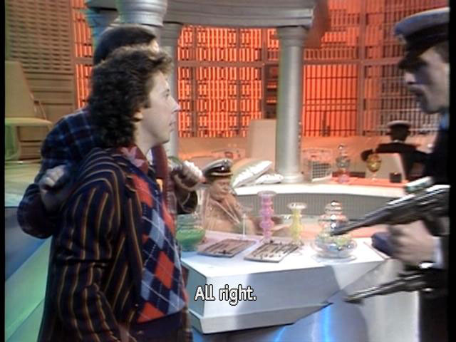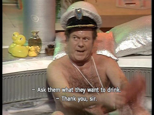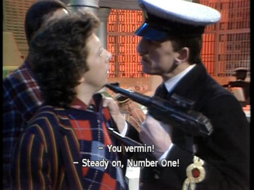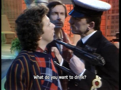 [Captain] Oh, very well. [Captain] Ask them what they want to drink. [Number One] Thank you, sir. [Number One] All right. [Number One] You scum! [Number One] You vermin! [Captain] Steady on, Number One! [Number One] What do you want to drink? |
