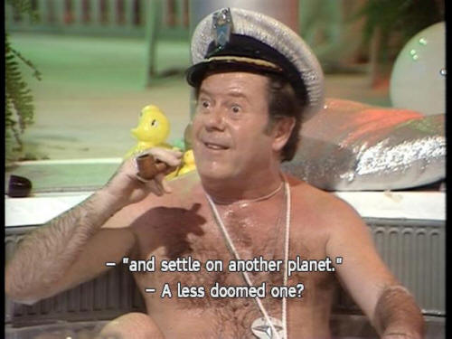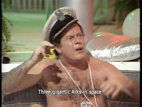 [Captain] "and settle on another planet." [Arthur] A less doomed one? [Captain] Precisely. So it was decided to build three gigantic ships. [Captain] Three gigantic Arks in space. [Captain] The idea was that into the first ship would go all the brilliant leaders, scientists, [Captain] the great artists, you know, all the achievers. |