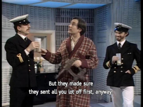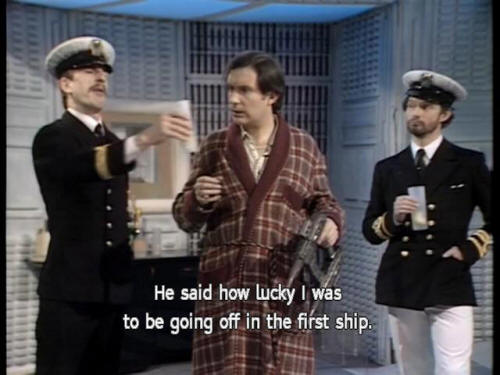 [Ford] Really? [Number One] Yes. [Number One] He said how lucky I was to be going off in the first ship. [Arthur] But they made sure they sent all you lot off first, anyway. [Captain] Oh, yes! And everyone said -- very nice I thought -- [Captain] how important for morale to feel that they were arriving on another planet [Captain] where you could get a good haircut and where the phones were clean. |