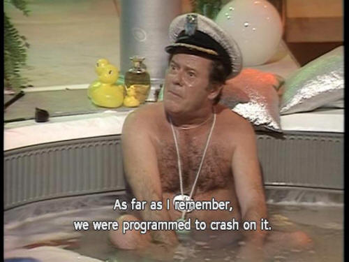 [Captain] We're nearly there. Nearly there. [Captain] I should be out of this bath, in fact ... [Captain] Oh, why stop just when I'm enjoying it? [Arthur] We are about to land, then? [Captain] Not exactly land, no. [Captain] As far as I remember, we were programmed to crash on it. |