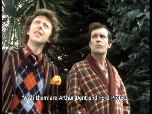 'Meanwhile, the remaining useless third crash-landed 'into the prehistoric dawn of a small blue-green planet 'at the unfashionable end of the Western Spiral arm of the Galaxy.' [Ford] It's odd, isn't it? 'With them are Arthur Dent and Ford Prefect. |