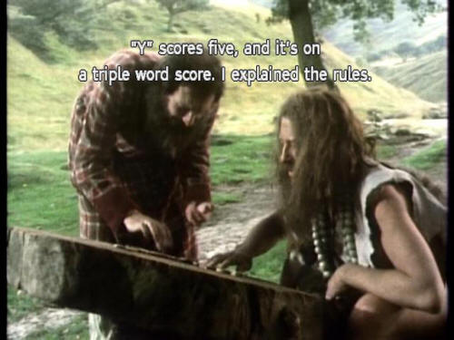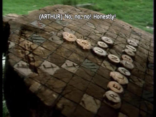 [Manager] Strange chap. What about those documentary things? [Captain] Just time for another bath! [Captain] Sponge, somebody! [Arthur] No, no, no! Honestly! [Arthur] "Y" scores five, and it's on a triple word score. I explained the rules. |
