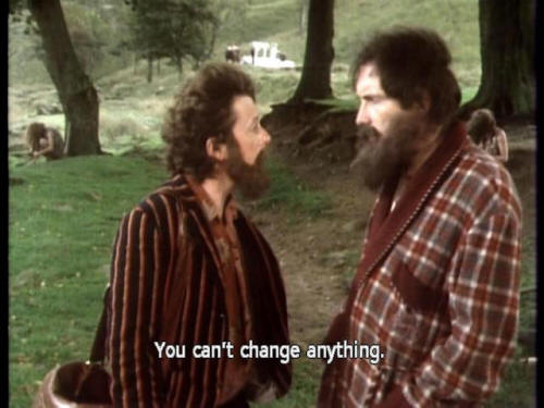 [Ford] The human race is currently standing around a bath making documentaries! [Arthur] Surely we can do something? [Ford] It's all been done, we've seen it. [Ford] You know the history of the Earth and its demolition by the Vogons. [Ford] You can't change anything. [Arthur] And all because the Golgafrinchans arrived here on their B Ark! [Ford] Ah, well. (CAVEMEN GRUNTING) |
