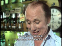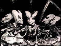 Hitchhiker's Guide to the Galaxy -- Illustrated Screenplay and Screencap Gallery (Transcribed from the movie by Tara Carreon, American Buddha Online Librarian) TIME: 06:30 DESTRUCTION OF EARTH DUE: 11:46:00 TIME TO ELAPSE BEFORE END OF THE WORLD: 05:16:48 This is the story of the Hitchhiker's Guide To the Galaxy, perhaps the most remarkable, certainly the most successful book ever to come out of the great publishing corporations of Ursa Minor. More popular than The Celestial Home Care Omnibus, better selling than Fifty-three More Things To Do in Zero Gravity, and more controversial than Oolon Colluphid's trilogy of philosophical blockbusters, Where God Went Wrong, Some More of God's Greatest Mistakes, and Who is This God Person Anyway? And in many of the more relaxed civilizations on the Outer Eastern Rim of the Galaxy, the Hitchhiker's Guide has already supplanted the great Encyclopaedia Galactica as the standard repository of all knowledge and wisdom, for though it has many omissions and contains much that is apocryphal, or at least warrantly inaccurate, it scores over the older, more pedestrian work in two important respects. First, it is slightly cheaper and, secondly, it has the words: DON'T PANIC inscribed in large, friendly letters on the cover. To tell the story of the book, it is best to tell the story of some of those whose lives it affected. A human from the planet Earth was one of them, though, as our story opens, he no more knows his destiny than a tea leaf knows the history of the East India Company. His name is Arthur Dent, he is a six-foot-tall ape descendant, and someone is trying to drive a bypass through his home. (RUMBLING) (BIRDS TWITTER) [Construction Supervisor] Come off it, Mr. Dent -- you can't win, you know. You can't lie in front of the bulldozers indefinitely. [Arthur Dent] I'm game. We'll see who rusts first! [Construction Supervisor] You're going to have to accept it. This bypass has got to be built and it's going to be built. Nothing you can say ... [Arthur Dent] Why's it got to be built? [Construction Supervisor] What do you man -- why's it got to be built? It's a bypass! You've got to build bypasses. You were quite entitled to make any suggestions or protests at the appropriate time. [Arthur Dent] Appropriate time?! The first I heard about it was when a workman arrived at the door yesterday. I thought he'd come to clean the windows. And he told me he'd come to demolish the house! Oh, he didn't tell me straightaway, of course. No, first he wiped a couple of windows and charged me a fiver! Then he told me! [Construction Supervisor] But, Mr. Dent, the plans have been available in the planning office for the last nine months! [Arthur Dent] Oh, yes, of course. As soon as I heard, I went straight round to see them. You hadn't exactly gone out of your way to call much attention to them, have you? Like telling anybody, or anything? [Construction Supervisor] But the plans were on display! [Arthur Dent] On display? I eventually had to go down to the cellar! [Construction Supervisor] That's the display department! [Arthur Dent] With a torch! [Construction Supervisor] The lights are probably out. [Arthur Dent] So had the stairs! [Construction Supervisor] But you did see the notice, didn't you? [Arthur Dent] Oh, yes. It was on display in the bottom of a locked filing cabinet, stuck in a disused lavatory with a sign outside the door saying, "Beware of the leopard!" Ever thought of going into advertising? (ENGINE STARTS) [Arthur Dent] And you don't get me like that either! [Construction Supervisor] Mr. Dent, have you any idea how much damage this bulldozer would suffer if I were to let it run straight over you? [Arthur Dent] How much? [Construction Supervisor] None at all! [Narrator] By a strange coincidence, "None at all" is exactly how much suspicion the ape descendant Arthur Dent had that one of his closest friends was not descended from an ape, but was in fact from a small planet somewhere in the vicinity of Betelgeuse. Arthur Dent's failure to suspect this reflects the care with which his friend blended himself into human society, after a fairly shaky start. When he first arrived 15 years ago, the minimal research he had done suggested to him that the name Ford Prefect would be nicely inconspicuous. He will enter our story in 30 seconds and say, "Hello, Arthur." The ape descendant will greet him in return but, in deference to a million years of human evolution, he will not attempt to pick fleas off him. Earthmen are not proud of their ancestors and never invite them round to dinner. [Ford Prefect] Hello, Arthur. [Arthur Dent] Ford, hi. How are you? [Ford Prefect] Fine. Look, are you busy? [Arthur Dent] Busy?! Well, I've just got this bulldozer to lie in front of, or it'll knock my house down, but otherwise ... no, not especially. Why? [Ford Prefect] Good. Anywhere we can talk? [Arthur Dent] What? [Ford Prefect] We've got to talk. [Arthur Dent] Fine! Talk. [Ford Prefect] And drink. It's vitally important that we talk and drink. Now! We'll go to the pub in the village. [Arthur Dent] Ford, you don't understand. That man wants to knock my house down. [Ford Prefect] Well, he can do that whilst you're away, can't he? [Arthur Dent] I don't want him to! [Ford Prefect] Ach! [Arthur Dent] Ford? What's the matter? [Ford Prefect] Nothing ... nothing's the matter. Listen tome. I've got to tell you the most important thing you've ever heard. I've got to tell you NOW, and I've got to tell you in the saloon bar of the Red Lion. [Arthur Dent] Why? [Ford Prefect] Because you're going to need a very stiff drink! [Arthur Dent] No! No! What about my house? [Ford Prefect] He wants to knock your house down? [Arthur Dent] Yes. [Ford Prefect] And he can't because you're lying in the way of his bulldozer? [Arthur Dent] Exactly! [Ford Prefect] I think we can come to some arrangement. Excuse me! [Construction Supervisor] Hello? Yes? Has Mr. Dent come to his senses yet? [Ford Prefect] Can we, 