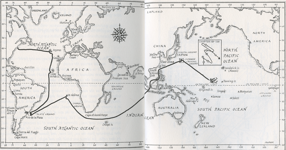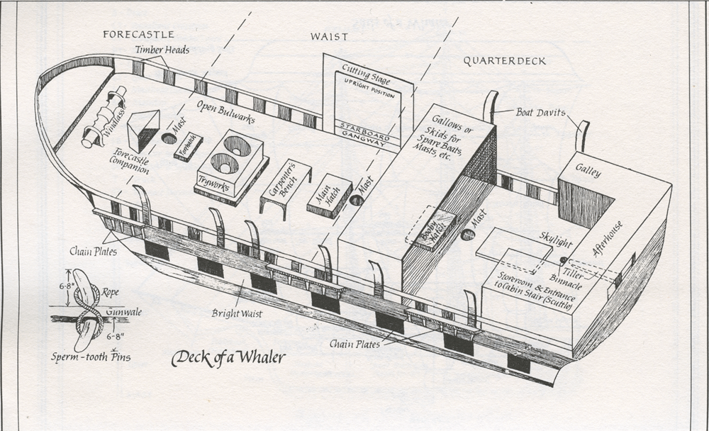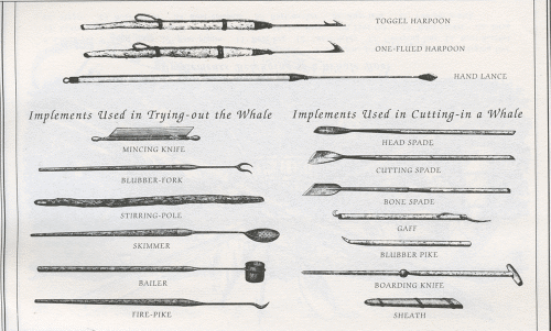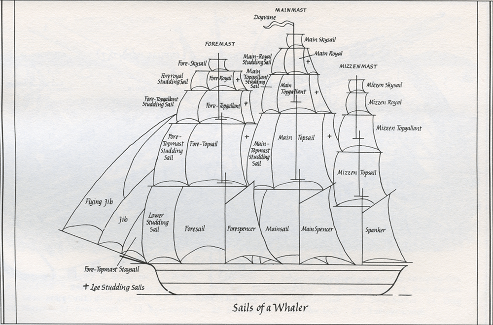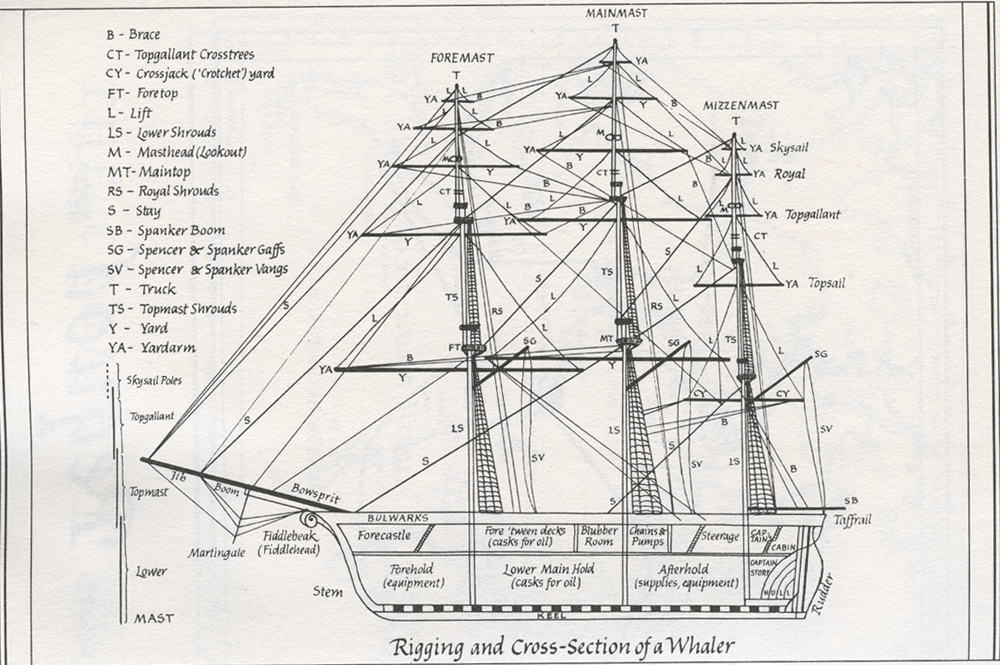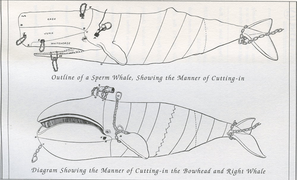 MAPS AND ILLUSTRATIONSTHE CRUISE OF THE PEQUOD Rigging and Cross-Section of a Whaler Sails of a Whaler Deck of a Whaler Implements Belonging to a Whale Boat: (1) Oar, (2) Boat-waif, (3) Boat-hook, (4) Paddle, (5) Boat-sails, (6) Sweeping-line-buoy, (7) Lead to Sweeping-line, (8) Chock-pin, (9) Short-warp, (10) Boat-piggin, (11) Boat-keg, (12) Lantern-key, (13) Sweeping-line, (14) Boat-hatchet, (15) Lance-warp, (16) Boat-grapnel, (17) Boat-knife, (18) Fog-horn, (19) Line-tub, (20) Boat-bucket, (21) Drag, (22) Nipper, (23) Boat-crotch, (24) Boat-compass, (25) Boat-anchor, (26) Row-lock, (27) Tub-oar-crotch Implements Used in Trying-out the Whale; Implements Used in Cutting-in a Whale Outline of a Sperm Whale Showing the Manner of Cutting-in; Diagram Showing the Manner of Cutting-in the Bowhead and Right Whale