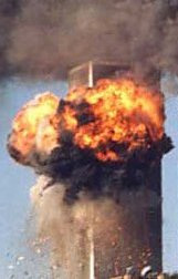There's more. Keep an eye on the adjacent east side of the building, which is also visible. See how, a few frames into the explosion, a white jet of smoke erupts out of the east side at the same level as the plane. The jet comes straight out of the wall at right angles to it, not angled in accordance with the trajectory of the plane. Also it's just white smoke and dust, no orange flames or anything like that. It is clearly a bomb going off, creating the gash that appears on the east wall. I know what I am describing sounds incredible. I suggest only that you look at the footage yourself and come to your own conclusions about what you see. The plane that hit the North Tower was not American Airlines Flight 11. It was not a Boeing 767. It was a custom-built military plane carrying three missiles that created the impression of a plane crash without leaving any wreckage. In order for it precisely to strike the correct part of the tower (in line with the bomb already planted in the east wall) it must have been flown remotely using cruise navigation. I believe a similar plane was used to strike the Pentagon. The 'Conspiracy Theorists' have got it dead right this time. The true Flights 11, 175, 77 and 93 were indeed substituted with other planes when the transponders were switched off. Someone hijacked the hijackers to make sure the job was done properly. The 'Fireman's Video' is Bush's true smoking gun. It is in the public domain and it is even available on DVD. It is probably sitting in the video shelves of thousands and thousands of homes across the world. It is vitally important that the American people see this video frame by frame so they can make their own minds up about what really happened on September 11. There has been a silent coup in America but few have noticed yet. The Bush Administration is clearly very sinister indeed and God only knows what it has in store for us next. There is a clue though in the things of which it accuses Saddam Hussein: building and using weapons of mass destruction (nuclear and biological) and killing his own people. When Bush describes Saddam he is describing himself. We have entered the Age of the Conjurer and it is going to be a tricky time. The 9-11 stunt was a huge magic trick and we all bought it at first. Magicians can be very convincing. You have to look very hard to see the trick and not be fooled. On this occasion slow motion exposes the sleight of hand, but remember how the magician works: he can make almost anything seem real if he can make his audience look in the wrong place at crucial moments. Only the American people can now stop the imminent slaughter and the imposition of a global fascist police state, but they are currently sleepwalking into their own enslavement. It may already be too late. But maybe if enough Americans get out their videos and their remote controls (pardon the pun) and take a long hard look at that remarkable footage of that plane hitting the North Tower, then an armed and outraged middle America might just pull it off. Hah! Just in is this priceless piece of evidence — the Fireman's Video in QuickTime, good enough to see the action and with frame forward and backward capacity too! More Incredible Evidence