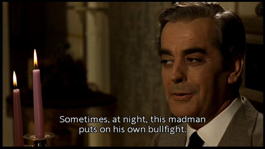 The balance. A good toreador must have a pure heart and clear thoughts, like monks or dancers. [Giorgio] Jose owns one of the biggest bull farms. Sometimes, at night, this madman puts on his own bullfight. [Juliet] What courage! Isn't it dangerous? |