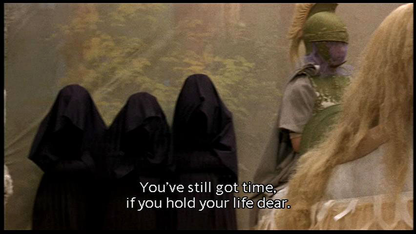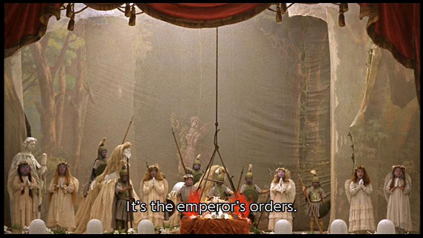 [Little Juliet] Yes, I do. [Boy] You’ve still got time, if you hold your life dear. [Little Juliet] I don’t care about the clemency you offer me, but about the salvation of my soul. [Boy] It’s the emperor’s orders. |