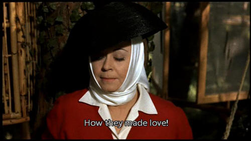 Didn't you notice? I saw two lovers in those bushes the other day. How they made love! I felt like applauding, they were so good. It looked so delicate, so festive from up here. Is your head still spinning? Let's have a drink. |