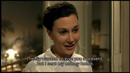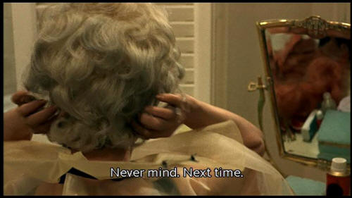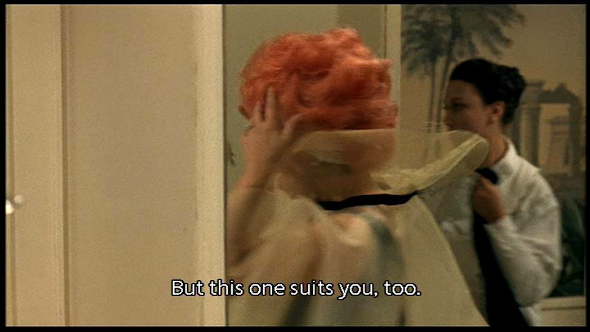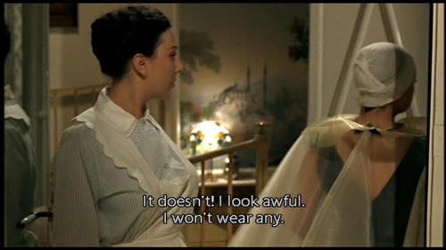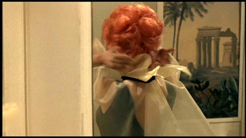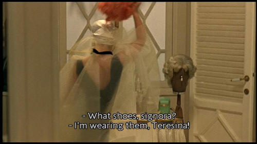 [Teresina] Sorry, Signora, I love the blond one. But this one suits you, too. What shoes, signora? [Juliet] I'm wearing them, Teresina! [Teresina] I really wanted to give you a present but I sent my money home. [Juliet] Never mind. Next time. [Teresina] This one looks really pretty on you. [Juliet] It doesn't! I look awful. I won't wear any. |